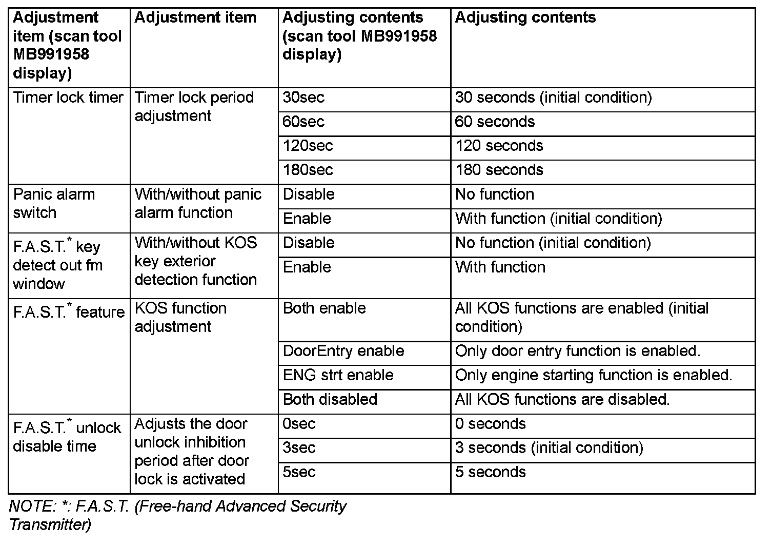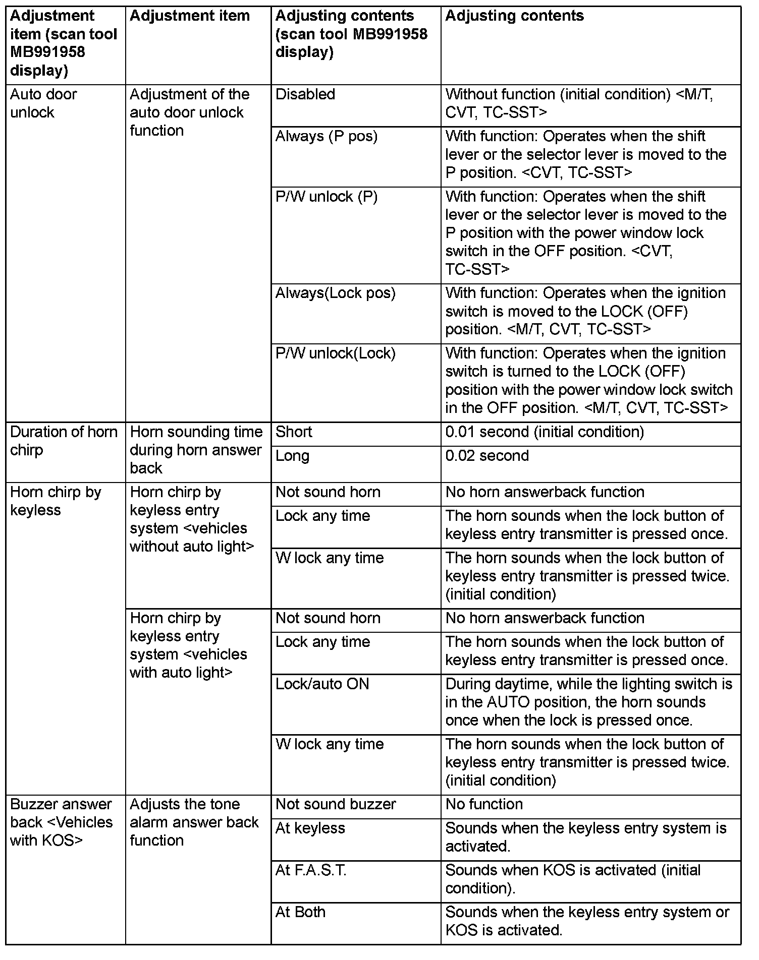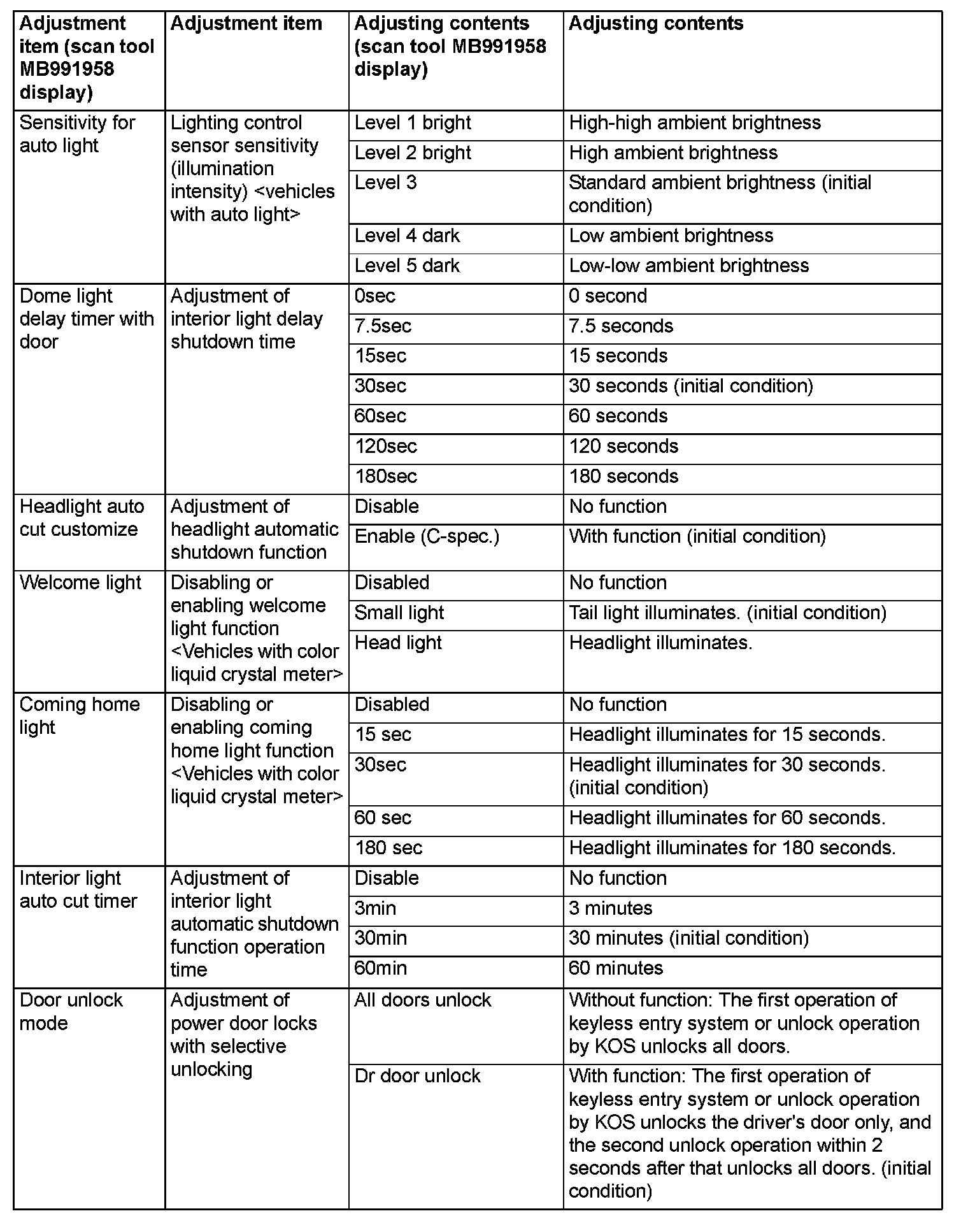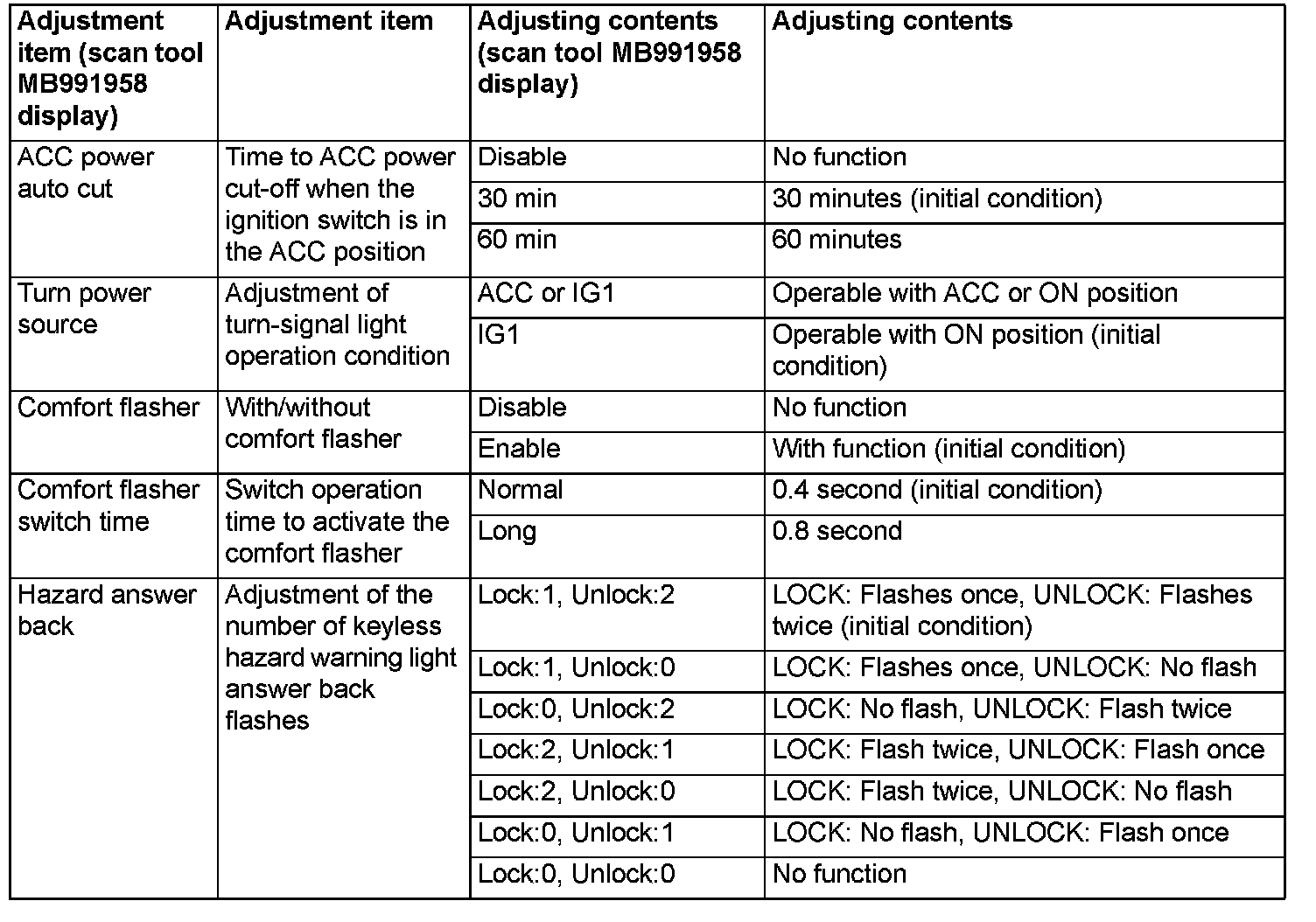 By operating the ETACS system or MMCS of scan tool MB991958, the following functions can be programmed. The programmed information is held even when the battery is disconnected.