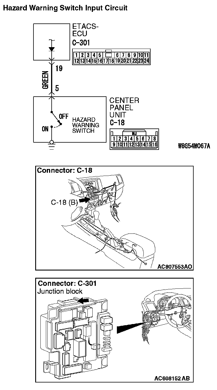STEP 4. Check the wiring harness between center panel unit connector C-18 (terminal 5) and ETACS-ECU connector C-301 (terminal 19).