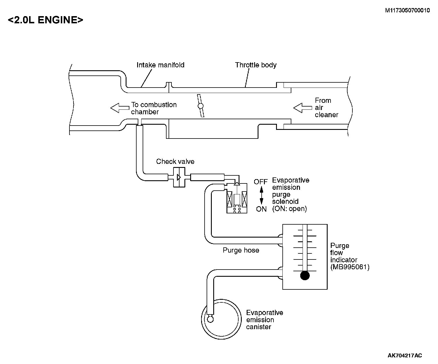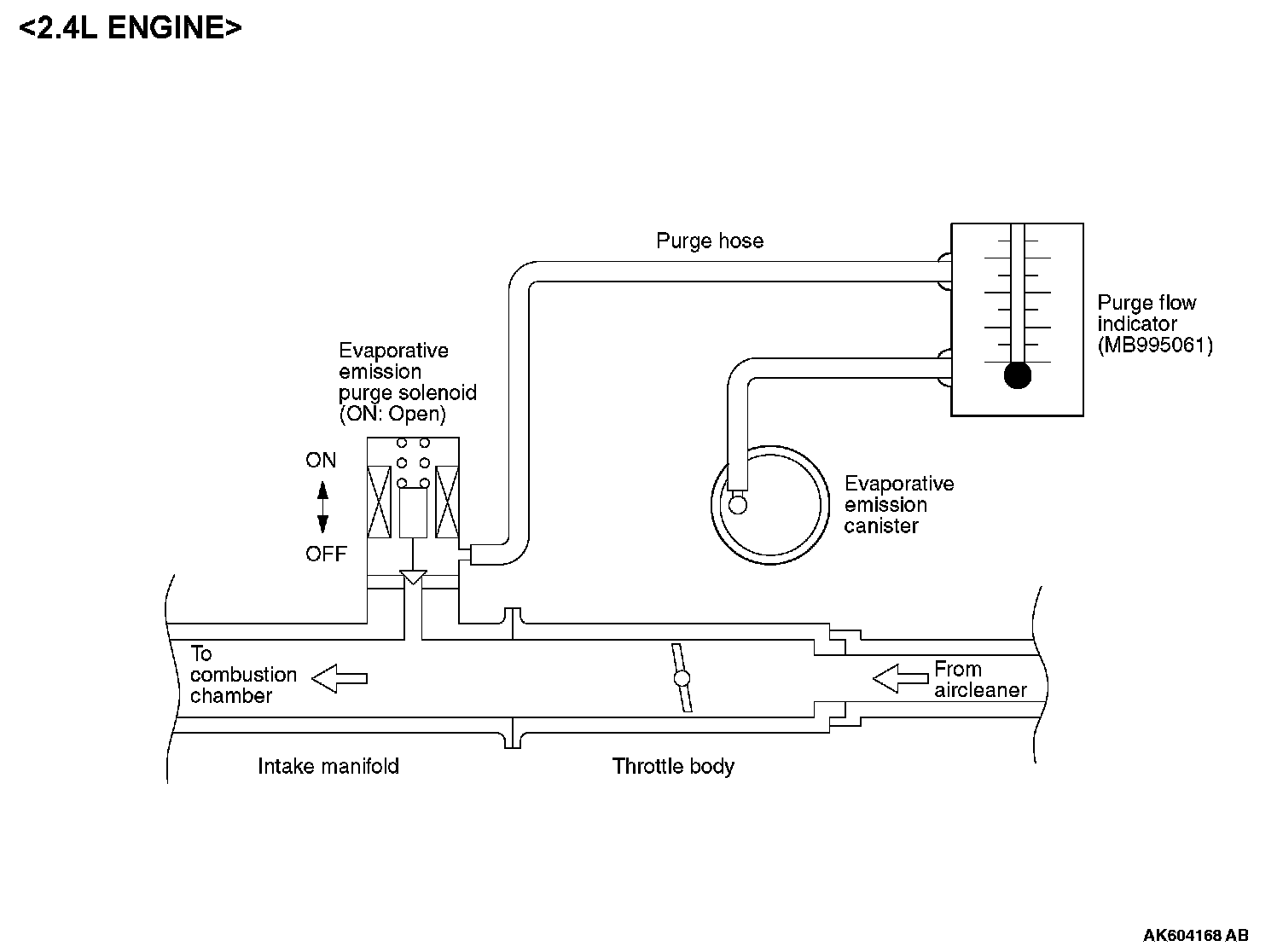 1. Disconnect the purge hose from the evaporative emission (EVAP) purge solenoid, and connect special tool MB995061 between the EVAP purge solenoid and the purge hose.