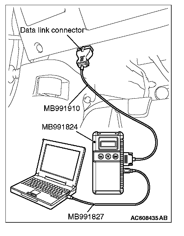1. Connect scan tool MB991958. Refer to "How to connect scan too (M.U.T.-III)." How to Connect the Scan Tool (M.U.T.-III)