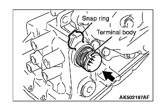 12. Remove the snap ring from the terminal body, and press the terminal body into the transaxle case.