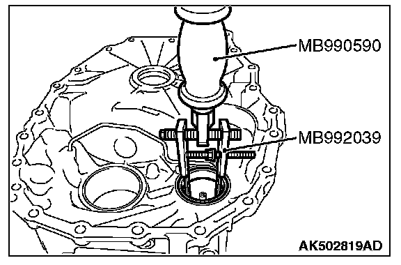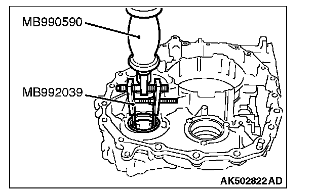 19. Using the special tools MB990590 and MB992039, remove the outer race of differential side bearing from the converter housing.