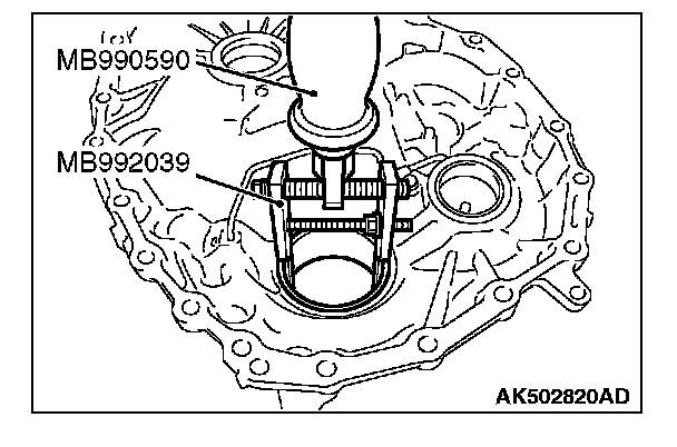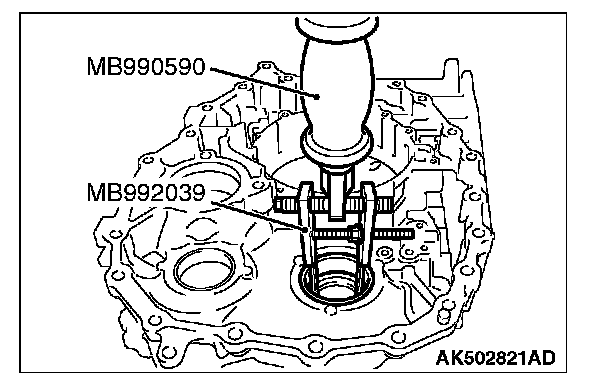 53. Using the special tools MB990590 and MB992039, remove outer race of the differential side bearing from the transaxle case.