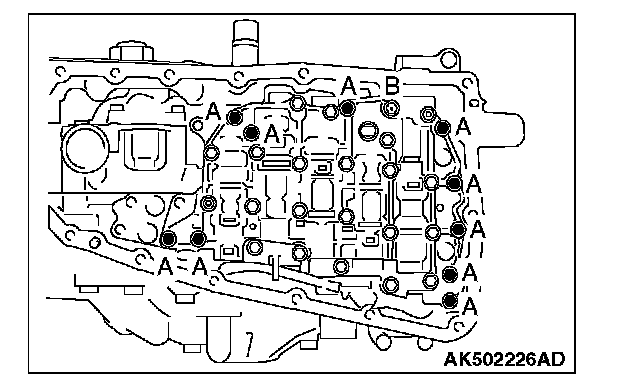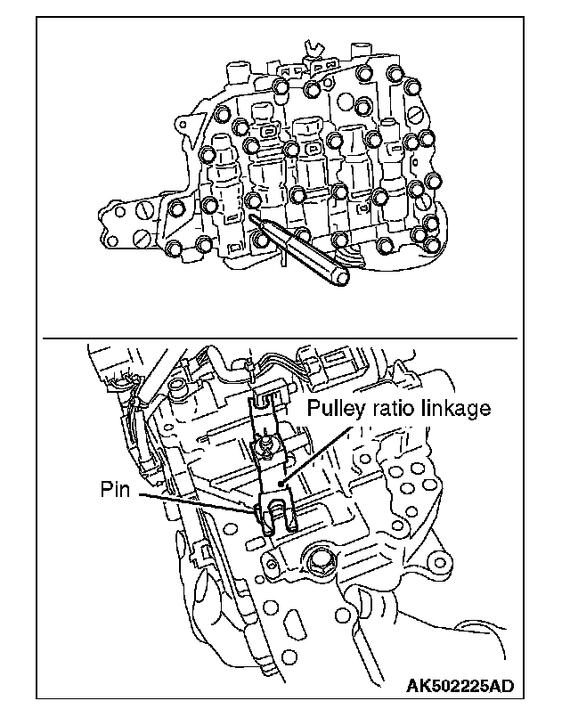 1) Insert pins etc. ([diameter] 3 mm (0-12 in)) into linkage stopper holes of the control valve assembly to fix the pulley ratio linkage.