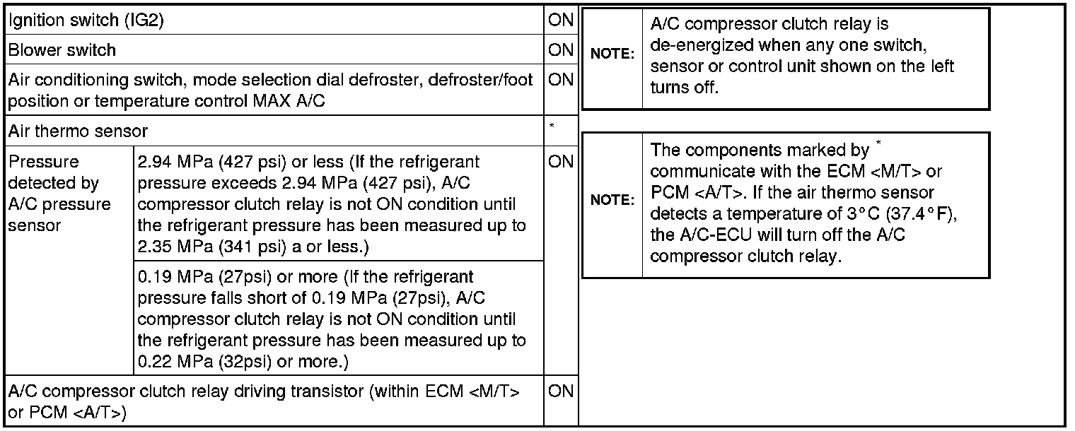 - When the air thermo sensor is activated, and the ignition switch, blower switch, and air conditioning switch are ON, the A/C compressor clutch relay is energized.