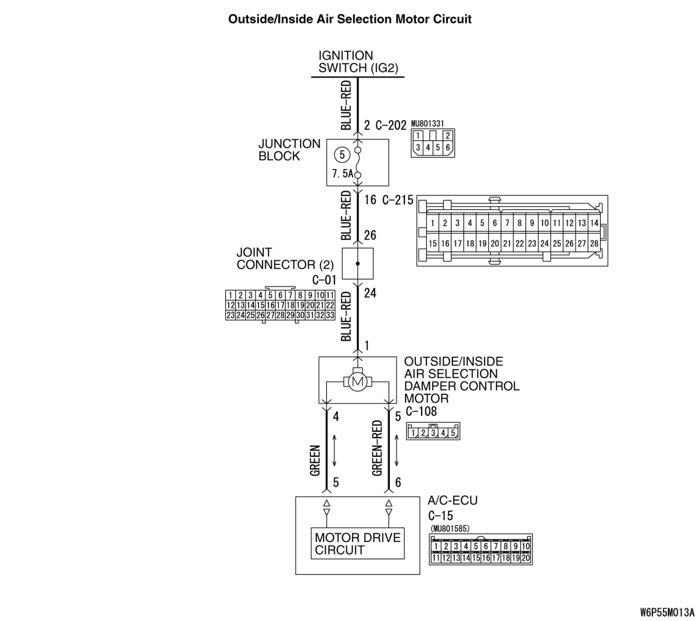 - Malfunction of the harness (outside/inside air selection damper control motor circuit is open/shorted to ground)