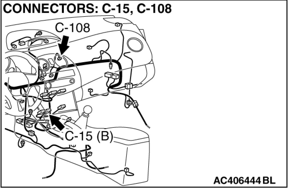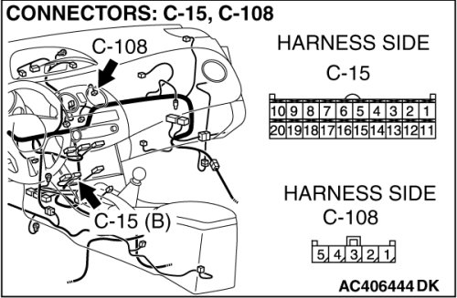 STEP 10. Check the wiring harness between A/C-ECU connector C-15 (terminal 6) and outside/inside air selection damper control motor connector C-108 (terminal 5).