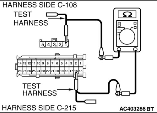 (1)Disconnect junction block connector C-215 and outside/inside air selection damper control motor connector C-108, and measure the resistance at the wiring harness side.
