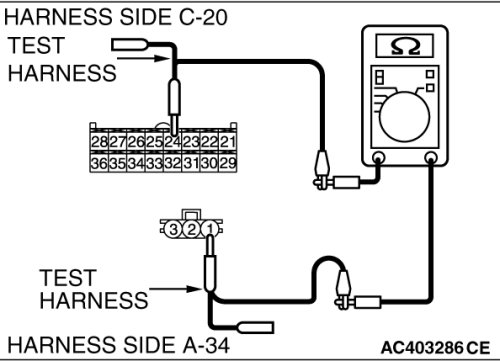 (1)Disconnect A/C-ECU connector C-20 and A/C pressure sensor connector A-34, and measure the resistance at the wiring harness side.