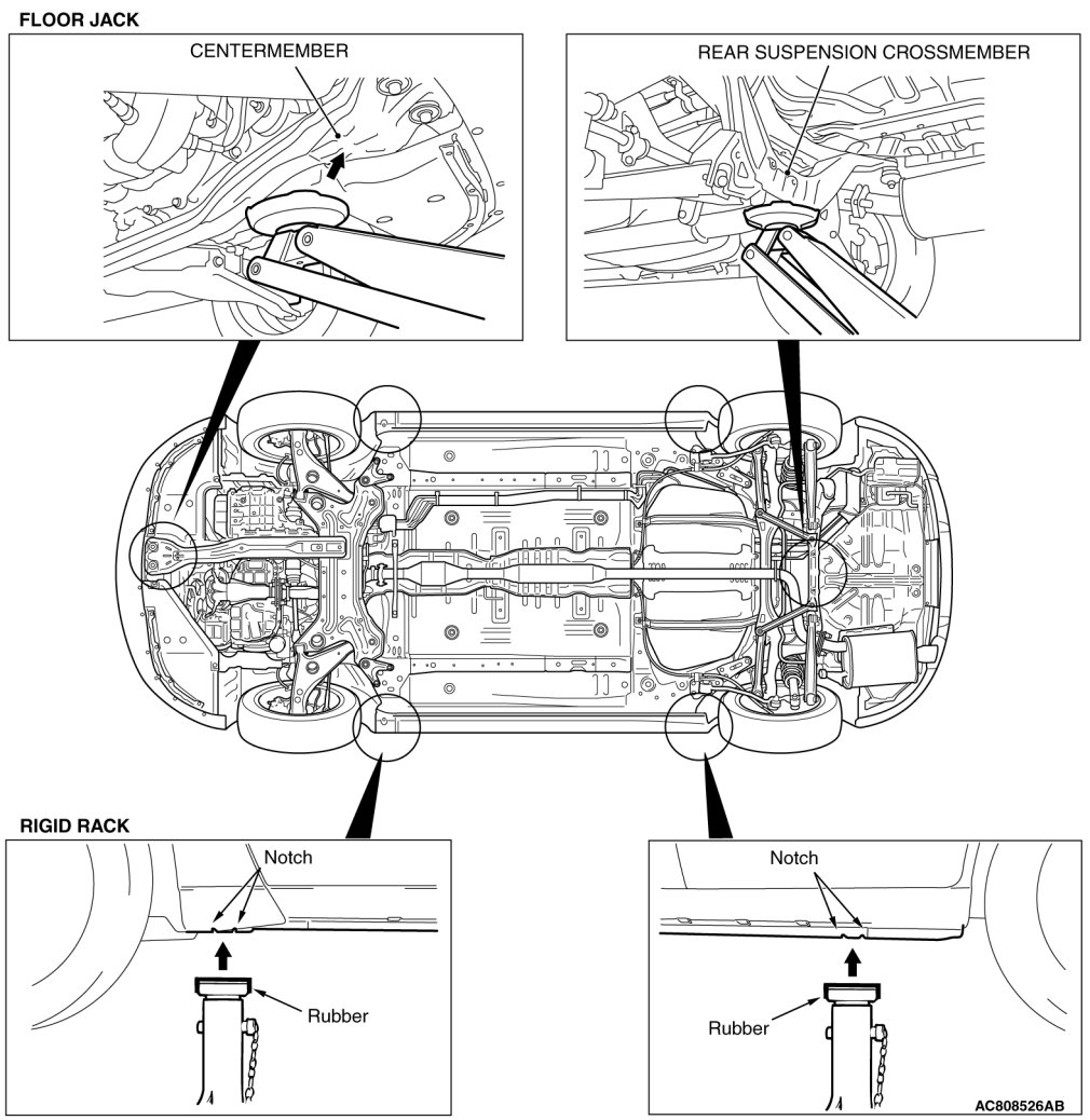 Special care should be taken when raising the vehicle on a frame contact type hoist. The hoist must be equipped with the proper adapters in order to support the vehicle at the proper locations.