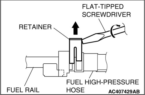 2. Turn the flat-tipped screwdriver approximately 90 degrees to the arrowed direction, and lift the retainer to unlock and disconnect the fuel high-pressure hose.