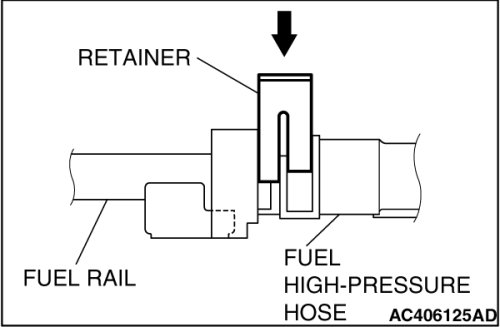 2. Install the fuel high-pressure hose to the fuel rail securely and push the retainer of fuel high-pressure hose downward and lock thoroughly.