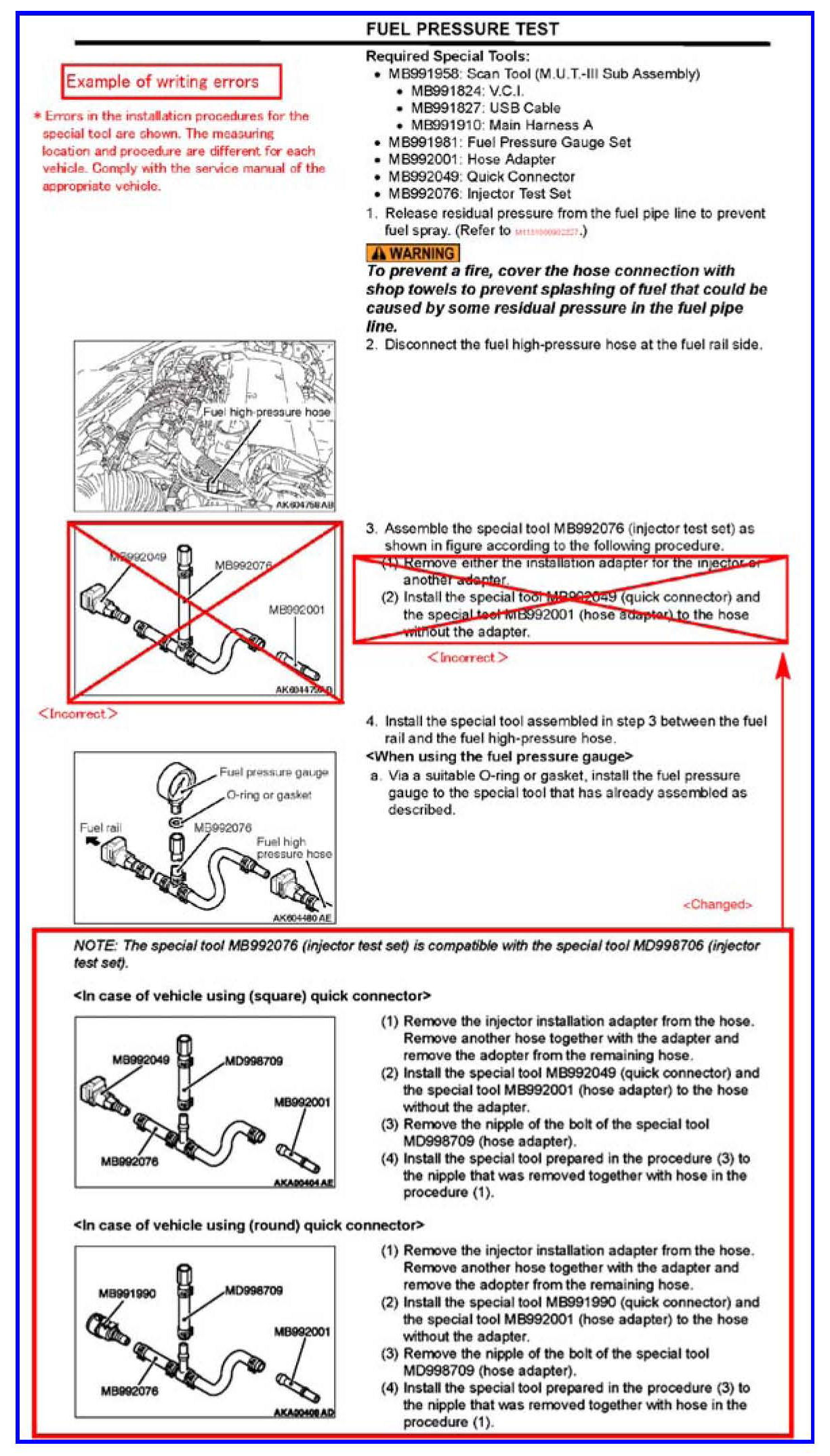 The instructions for assembling special tool MB992076 - Injector Test Set is incorrect in all service manuals. This TSB contains the correct procedure.