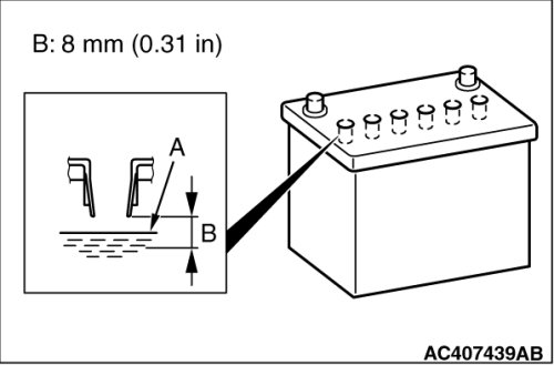 1. Ensure that the battery electrolyte level A within the range B shown in the figure. Add if the level is lower than the specified range.