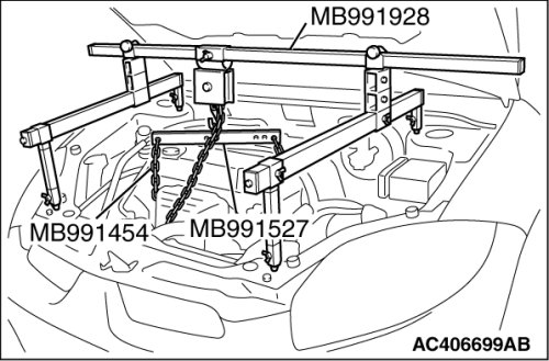 (2) Set special tool MB991527 and MB991454 (chain) to hold the engine/transaxle assembly.