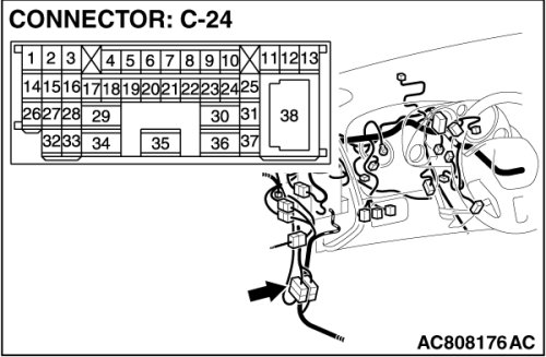 Also check intermediate connector C-24 for loose, corroded, or damaged terminals, or terminals pushed back in the connector. If intermediate connector C-24 is damaged, repair or replace the damaged component(s) as described in Harness Connector Inspection Harness Connector Inspection.