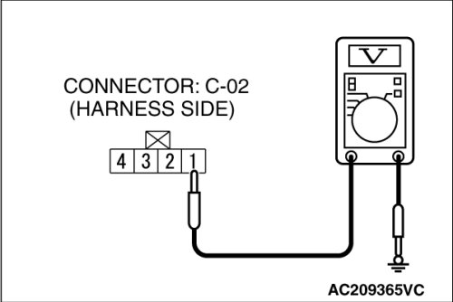(1)Disconnect security indicator connector C-02 and measure the voltage available at the wiring harness side of the connector.