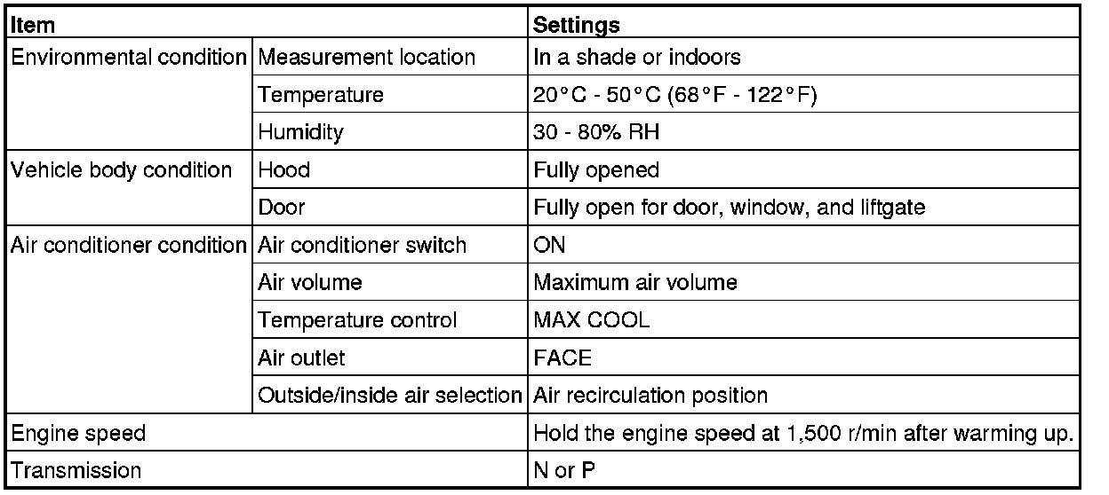 Check that the temperature/humidity of measurement location satisfies the test conditions, and then set the vehicle body conditions to the designated status according to the test conditions. If the temperature/humidity is not within the test conditions, an accurate judgment cannot be made. Therefore, postpone the performance test.