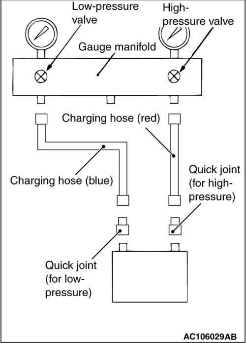 - On completion, stop the engine and wait until the high-pressure side of the gauge manifold is depressurized. Then remove the quick joints and the others.