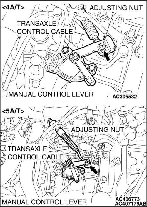 6. Gently push the transaxle control cable in the direction of the arrow, until the cable is taut. Tighten the adjusting nut.