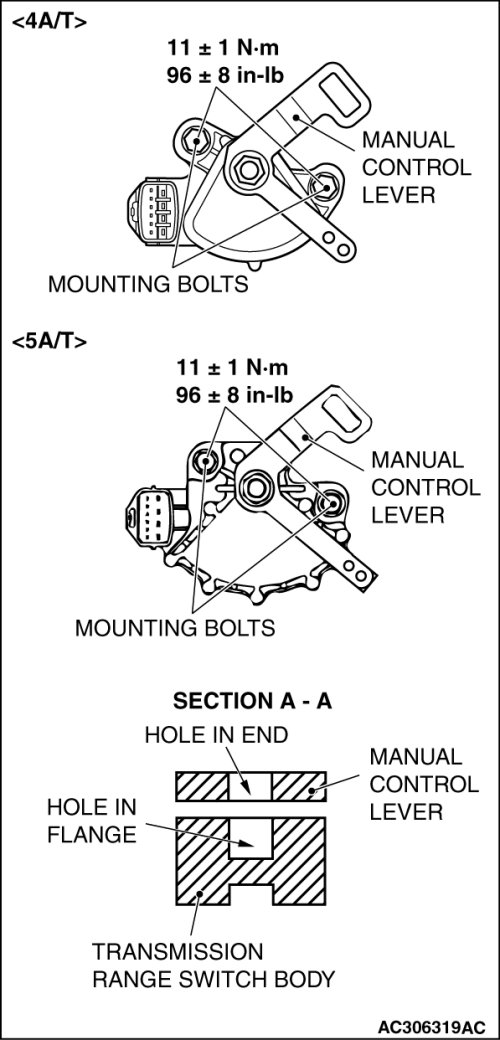 4. Loosen the transmission range switch body mounting bolts and turn the park/neutral position switch body so the hole in the end of the manual control lever and the hole (section A - A in the figure on the left) in the flange of the transmission range switch body flange are aligned.