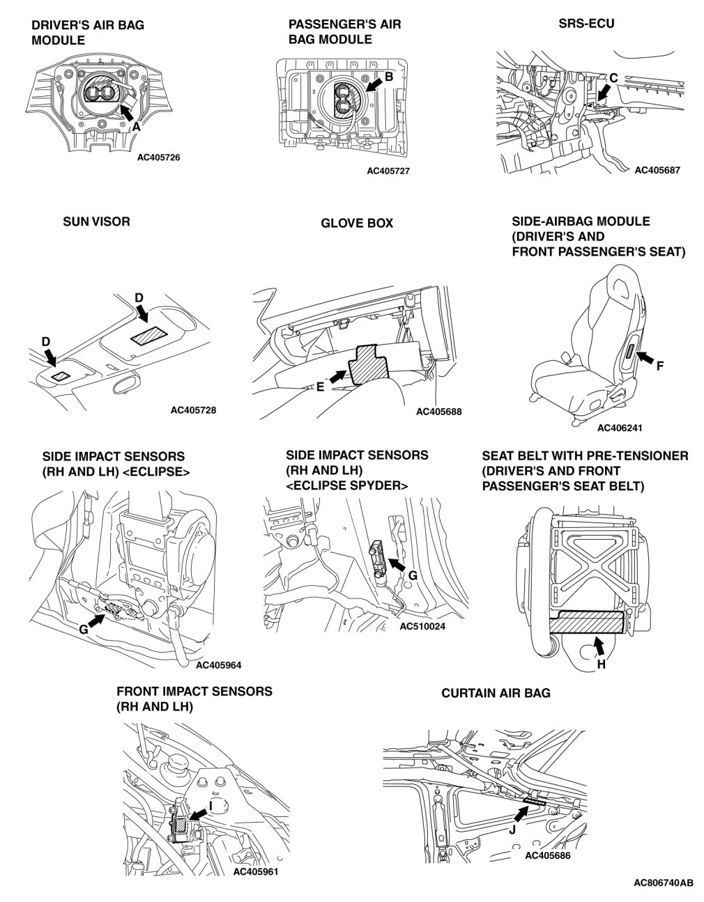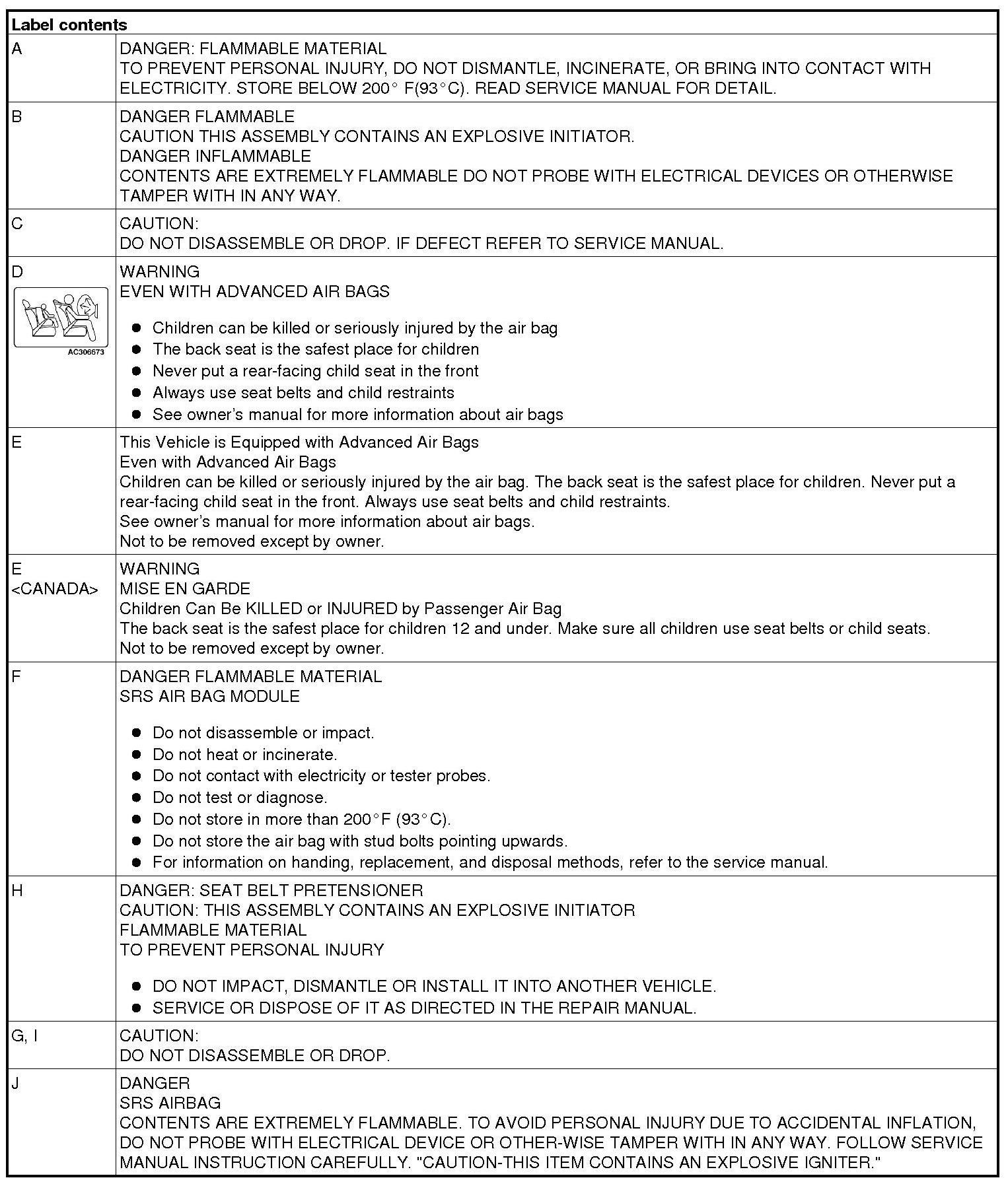 A number of caution labels related to the SRS are found in the vehicle, as shown in the following illustrations. Follow label instructions when servicing SRS. If the labels are dirty or damaged, replace them.