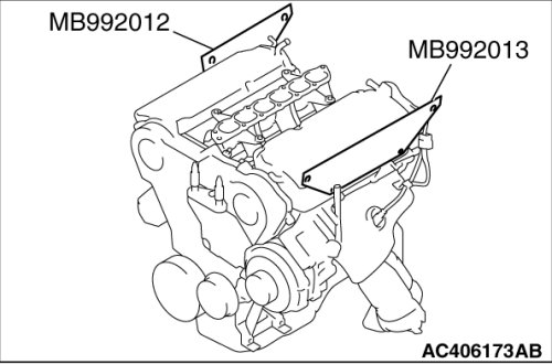 2. After removing the intake manifold plenum stay (rear) and the engine hanger, set special tool MB992012 and MB992013 to each cylinder head.
