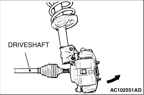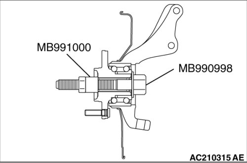 Do not apply pressure to the wheel bearing by the vehicle weight to avoid possible damage when the drive shaft is removed. If, however, vehicle weight must be applied to the bearing to move the vehicle, temporarily secure the wheel bearing by using special tools MB991000 and MB990998.