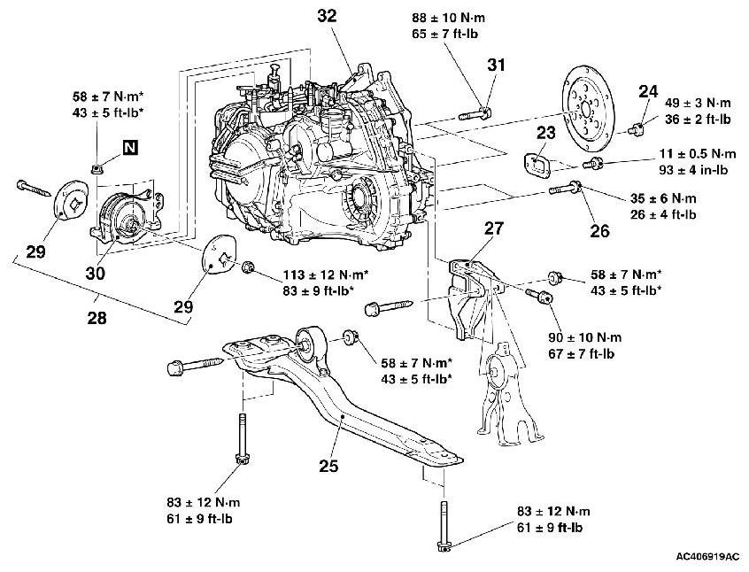 *: Indicates parts which should be temporarily tightened, and then fully tightened after placing the vehicle horizontally and loading the full weight of the engine on the vehicle body.