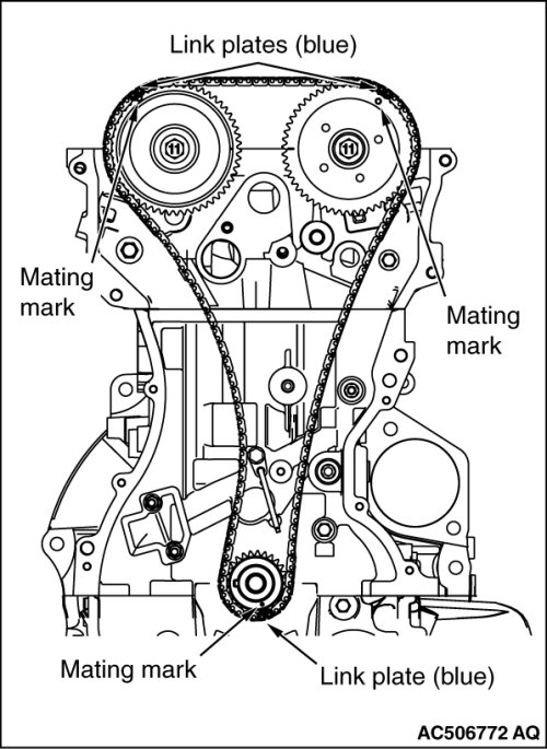At this time, it is not necessary that the link plate (blue) of the timing chain always aligns with each sprocket timing mark.