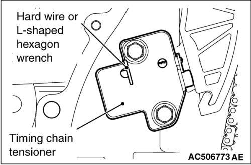 2. Remove the hard wire or L-shaped hexagon wrench fixing the plunger of the timing chain tensioner to apply tension to the timing chain.