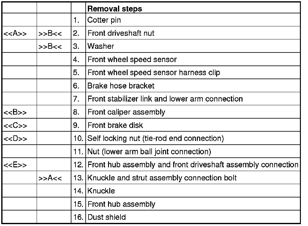 [[E]] FRONT HUB ASSEMBLY AND FRONT DRIVESHAFT ASSEMBLY DISCONNECTION