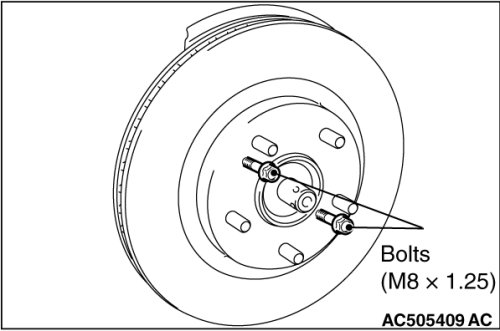 If the front brake disk removal is difficult, install bolts (M8 x 1.25) shown in the figure, and tighten them evenly and gradually to remove the front brake disk.