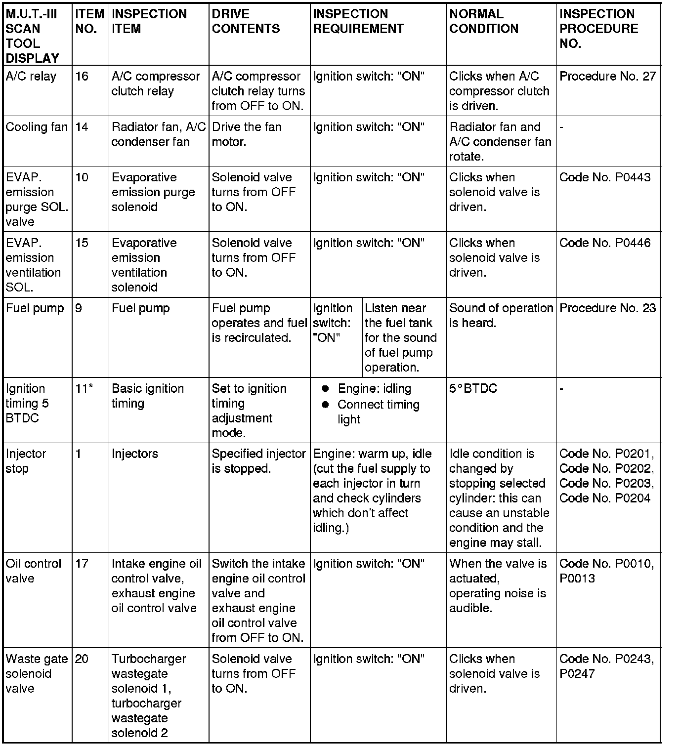 Actuator Test Reference Table