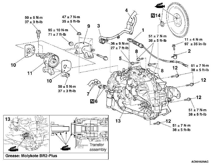 (2) Set the chain to the engine hanger plate (Special tool: MB992201) to support the engine and transaxle assembly. Remove the garage jack, and then remove the transaxle assembly upper part coupling bolts that have been loosened previously.