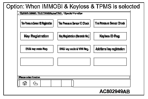 2. Select "F.A.S.T./IMMO/Keyless/TPMS" button from the "System Select" screen. Then, select the applicable option code item and push the OK button.
