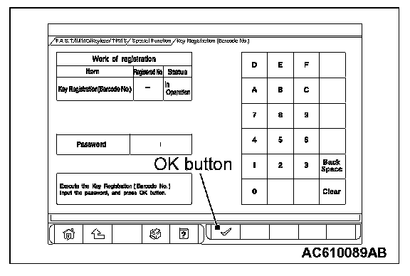 1. When "Key Registration (Barcode No.)" screen is displayed, enter the password for the key registration and press the OK button.