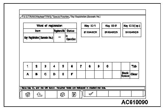 The ID codes necessary for the engine immobilizer system, the keyless entry system and the TPMS can be registered using the scan tool MB991958 (M.U.T.-III sub assembly). KOS and keyless operation key are indicated as F.A.S.T and F.A.S.T.-key respectively in the scan tool MB991958 (M.U.T.-III sub assembly) screen.