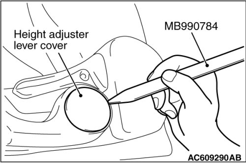 Use special tool MB990784 as shown to remove the height adjuster lever cover.