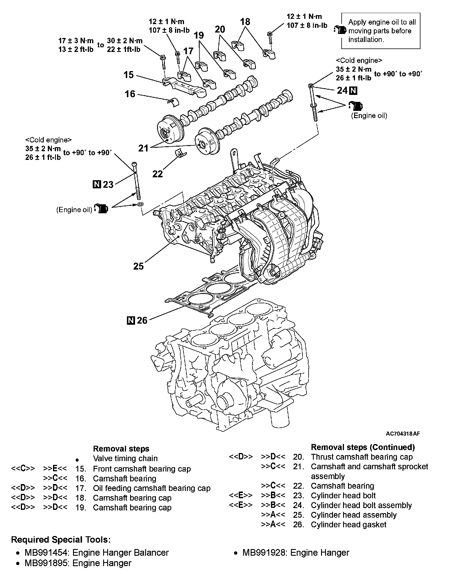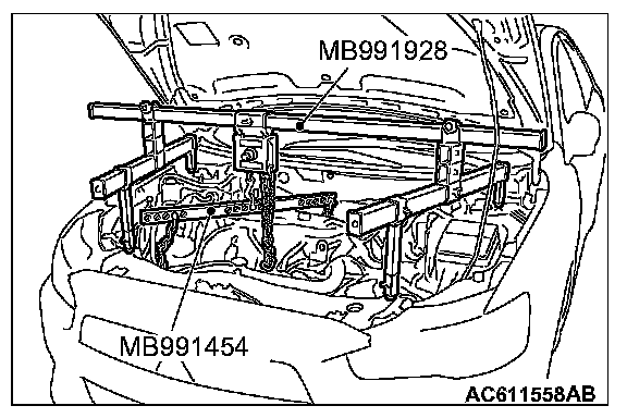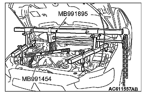 3. Install special tool MB991454, MB991928 or MB991895 which was installed for supporting the engine and transaxle assembly when the timing chain was removed.