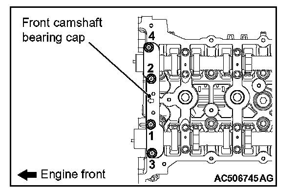 4. Loosen the front camshaft bearing cap mounting bolts in the order of number shown in the figure, and remove the front camshaft bearing cap.