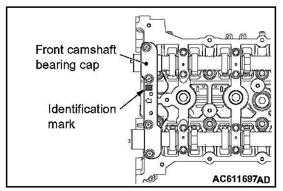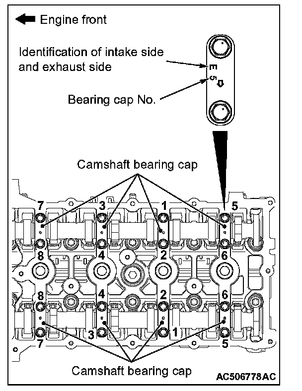 NOTE: Because the thrust camshaft bearing cap and camshaft bearing cap are the same in shape, check the bearing cap number and additionally its symbol to identify the intake and exhaust sides for correct installation.