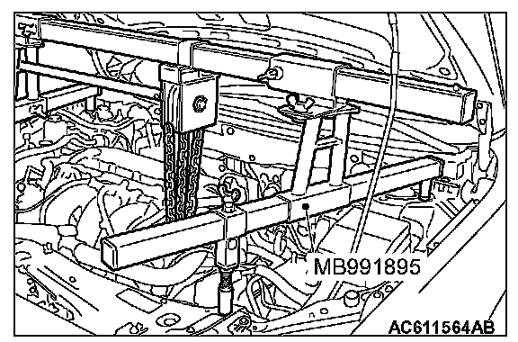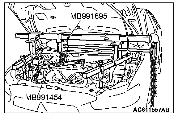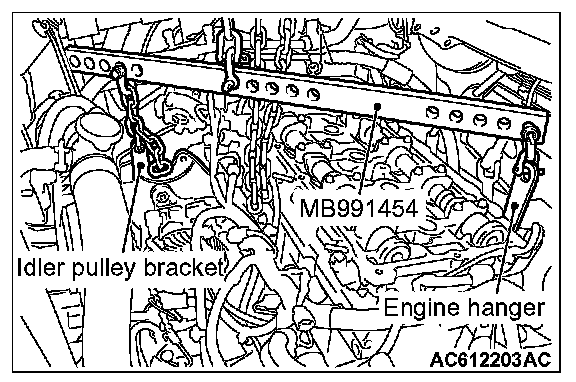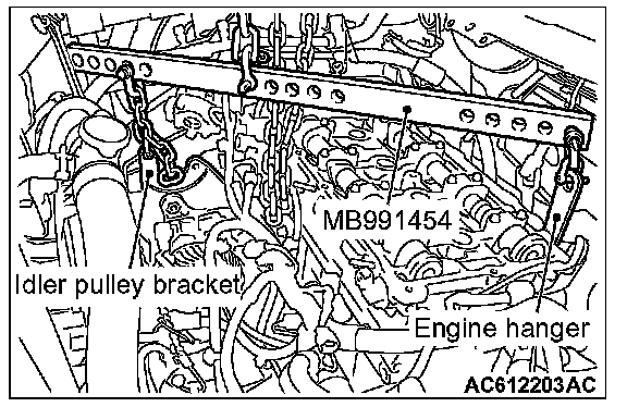 (2) Mount special tool MB991454 to the idler pulley bracket and engine hanger, and set it to special tool MB991895 to support the engine and transaxle assembly.