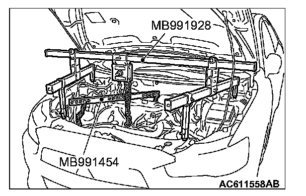(3) Mount special tool MB991454 to the idler pulley bracket and engine hanger, and set it to special tool MB991928 to support the engine and transaxle assembly.