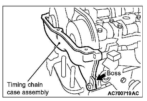If the adhesive strength of sealant on the timing chain case assembly is so strong that the boss may be damaged by peeling off, do not peel it off forcibly.