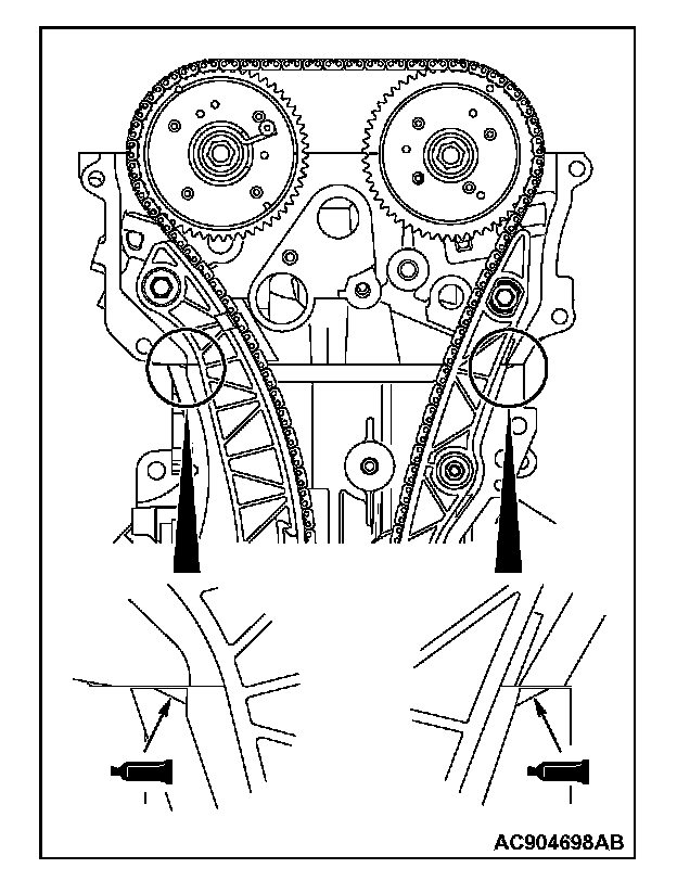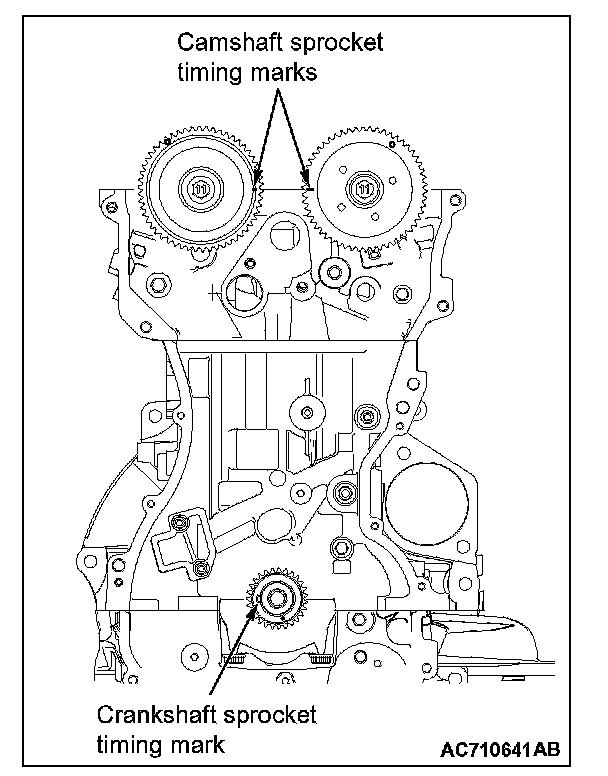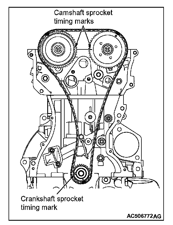 1. Set the timing marks of the camshaft sprockets and the crankshaft sprocket as shown in the figure.