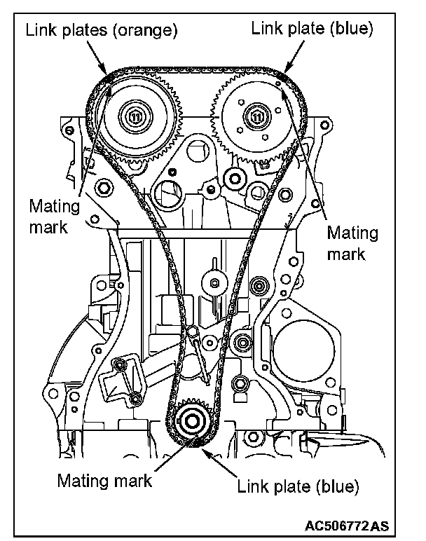 NOTE: At this time, it is not necessary that the link plate (orange or blue) of the timing chain always aligns with each sprocket timing mark.
