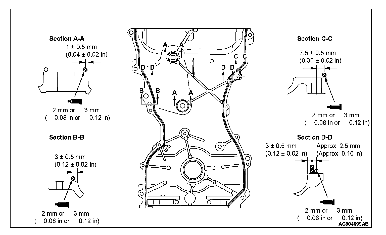 4. To the timing chain case assembly installation surface, apply the sealant without a gap. However, overlap the sealant at the "D" shown in the figure.