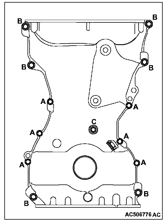 6. Insert the bolts to the timing chain case assembly as shown, and tighten them to the specified torque.