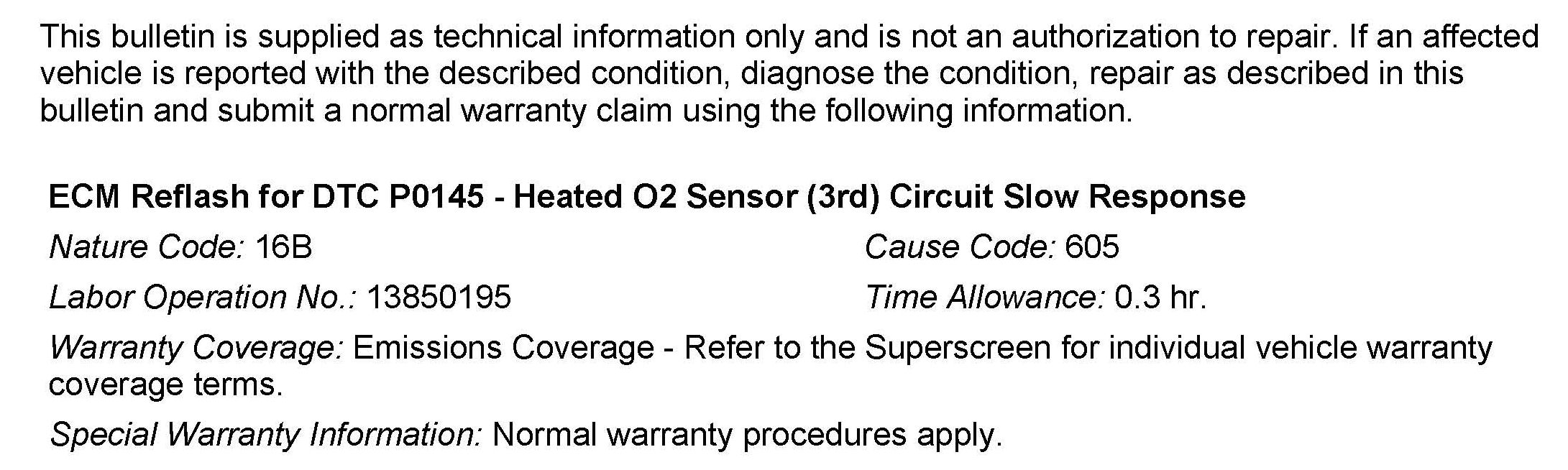 On some affected vehicles certified for California emissions, DTC P0145 may set in the ECM due to incorrect programming. In this case, the O2 sensor may not be defective and should not be replaced. If DTC P0145 returns after reprogramming, diagnose according to the service manual.
